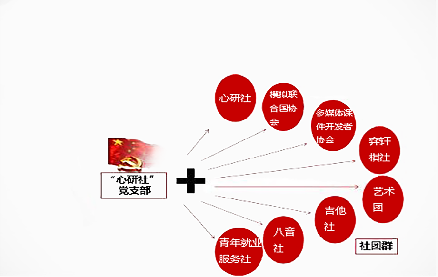 近年来,“心研社”党支部针对学院拥有“心研社”社团、八音乐团、艺术团等 8 个学生社团以及学生参与社团覆盖率达 90%左右的实际情况,创造性地提出了“党旗领航社团群”融合共建的大学生党建工作新机制、新模式,强力打造独具特色的党建品牌,取得显著成效。《人民日报》、《中国日报》、人民网、光明网、东方新闻、《山西日报》、《山西青年报》、香港卫视、搜狐网、黄河新闻网等主流媒体 50 余次报道了“心研社”党支部和“社团群”融合共建的工作盛况。
