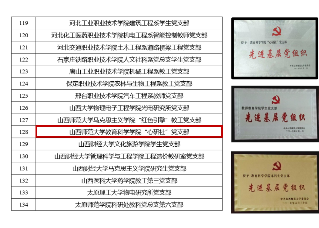 目前,“心研社”党支部在校外创建了 7 个服务基地,长期帮扶 10 所中小学校开展心理健康教育等实践活动。每年 5 月 25 日带领全校 18 个学院的数千名师生参与到心理健康教育中来,赢得了广大师生的一致好评。近年来,“心研社”先后 3 次被校党委授予“先进基层党组织”荣誉称号。2019 年 5 月,“心研社”社团在以往 27 次获得校级以上荣誉的基础上被共青团山西省委授予“全省五四红旗团支部”称号。12 月,“心研社”党支部成功入选教育部“全国党建工作样板支部”。