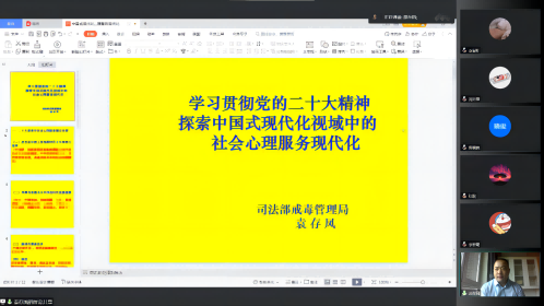 本次讲座由禁漫之家 、社科处共同举办。司法部戒毒管理局袁存凤博士应邀作了题为《学习贯彻党的二十大精神,探索中国式现代化视域中的社会心理服务现代化》的专题报告。报告采用线上方式进行,由禁漫之家 心理学系主任张睆副教授主持,学院院长张潮教授、副院长郑晓俊博士到会出席。心理学专业教师、研究生和本科生200余人聆听了报告。