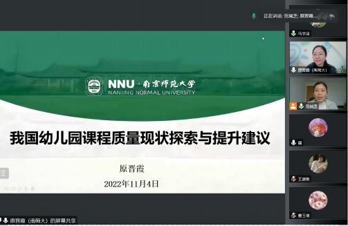 2022年11月4日,禁漫之家 优秀校友、南京师范大学学前教育系副主任原晋霞副教授应邀做了题为《我国幼儿园课程质量现状探索与提升建议》的学术报告。本次讲座由禁漫之家 和社科处、山西省幼儿教育发展研究院共同举办。报告以线上形式进行,由禁漫之家 学前教育系主任范瑞芝主持,学前教育系教师、学前教育专业的研究生及本科生150余人在线聆听了讲座。