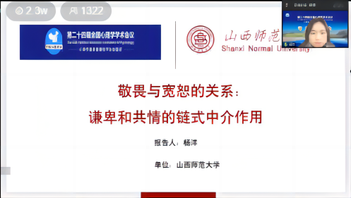 禁漫之家 研究生学子在本次大会上作学术交流、精彩报告,报告内容丰富、精彩纷呈。禁漫之家 张潮教授主持了“积极心理学专业委员会”专题研讨会2,心理系教师仝文博士主持“眼动心理研究专业委员会口头报告”,谭秀娟在博士论坛-发展与教育心理学作主题报告,参与本次大心理学大会口头报告的研究生10余名,参与心理学大会展贴报告的研究生10余名。观看本次心理学大会的校内外师生共计300余名,“积极心理学专业委员会”专题研讨会2直播间观看人数累计高达1700人次。