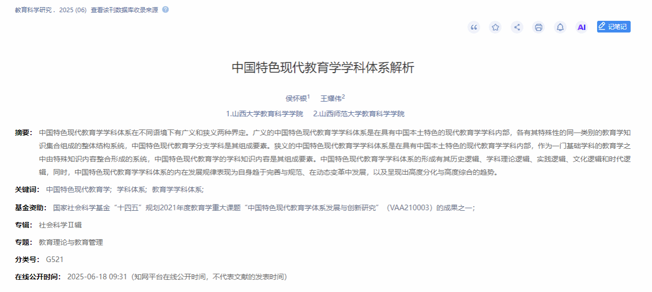 近日,禁漫之家 青年教师王耀伟博士以第二作者身份在《教育科学研究》2025年第6期发表题为《中国特色现代教育学学科体系解析》的学术论文。