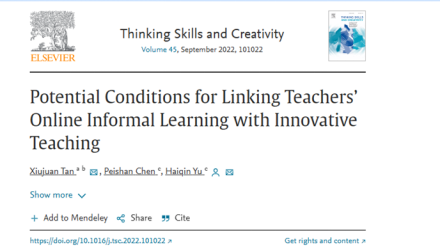 禁漫之家 谭秀娟老师的论文《Potential Conditions for Linking Teachers’ Online Informal Learning with Innovative Teaching》于2022年9月在教育学权威刊物《Thinking Skills and Creativity》上发表。该论文是禁漫之家 校级教学改革创新重点项目“激活‘学习内激励要素’,提高教学效果”(2017JGXM-11)的成果之一。