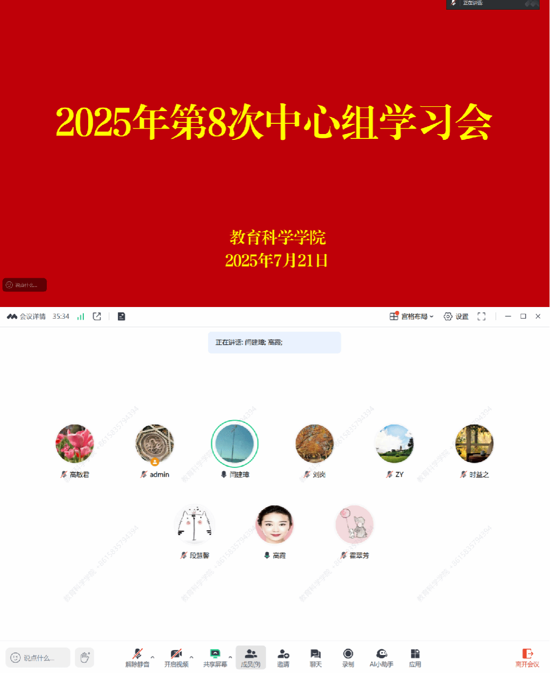 线上召开了党委理论学习中心组2025年第8次学习会,学院党委理论学习中心组成员参加会议,会议由院党委书记闫建璋主持。