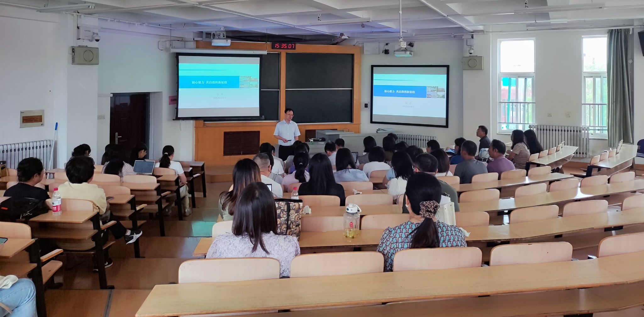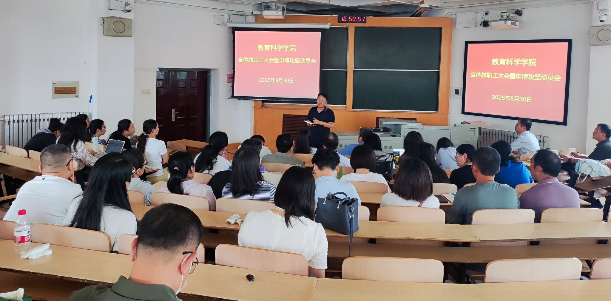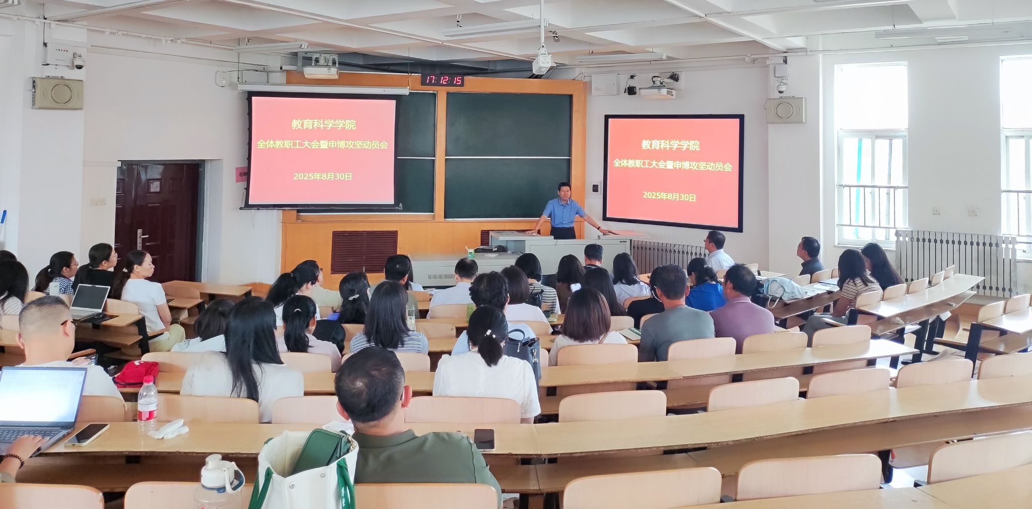 会上,赵英院长作了申博攻坚动员,以具体的数据详细分析了教育学一级学科建设的发展历程、基础条件、优势特色、短板不足,围绕学科方向凝练、学科团队运行、学术骨干成长、学术氛围营造、支持条件改善等内容,与全体教师交流了思路和想法,进一步明晰了教育学学科建设的目标方向和总体思路。他强调,教育学学科建设是学院发展的根基,要进一步增强攻坚的使命感、紧迫感,以申博这一具体的抓手,牵引学院科学研究、人才培养、社会服务、学术交流、教师发展等工作全面提质增效,尤其是要紧紧抓住团队建设这个重中之重,把“有组织的科研”真正落到实处,尽快实现标志性成果的突破。他指出,教师是学院核心竞争力的主体,是学院一切工作的最终依靠力量,要从每个环节、每个细节尊重教师,把这份发自内心的尊重融入渗透到学院一切工作中去;教师与学院是命运共同体、荣辱共同体、发展共同体,相互之间要多关注、多关心、多关照,相互支持、相互成就,共同把学院的事情办好、工作做好,不辜负学校和师生的期待。随后,赵英院长还通报了学院暑期重点工作,并就开学及新学期相关工作做了部署和安排。