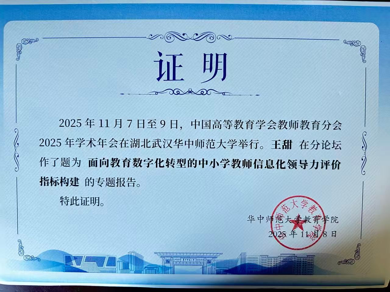 2025年11月7日至9日,禁漫之家 闫建璋、赵英、赵国栋、王甜及研究生等一行8人,参加由中国高等教育学会教师教育分会与华中师范大学联合主办、华中师范大学教育学院及人工智能教育学部共同承办的“中国高等教育学会教师教育分会2025年学术年会”。本次年会以“高质量教师教育创新发展与数字教育”为主题,吸引了来自全国各高校专家、学者及在读研究生等近五百人共赴武汉研讨交流。