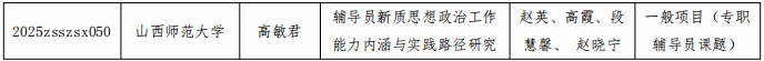 近日,省教育厅公布了2025年度山西省高等学校哲学社会科学研究项目(思想政治教育专项)立项结果,禁漫之家 专职辅导员高敏君申报的《辅导员新质思想政治工作能力内涵与实践路径研究》成功入选。该项目聚焦新时代背景下辅导员思想政治教育工作的创新发展需求,探索提升辅导员专业化、职业化水平的实践路径。