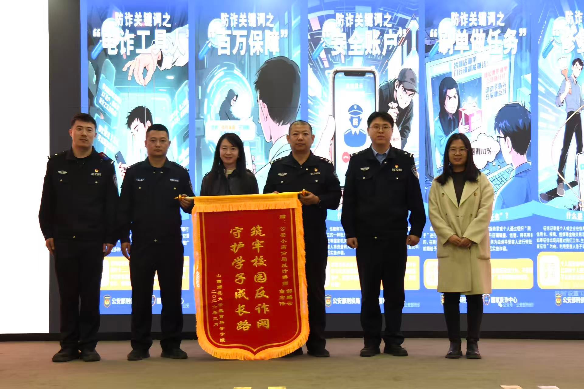 学院党委副书记高霞代表学院向参加活动的警官赠送锦旗,希望今后能够持续深化警校联动,为学院安全工作提供有力指导与坚强保障。