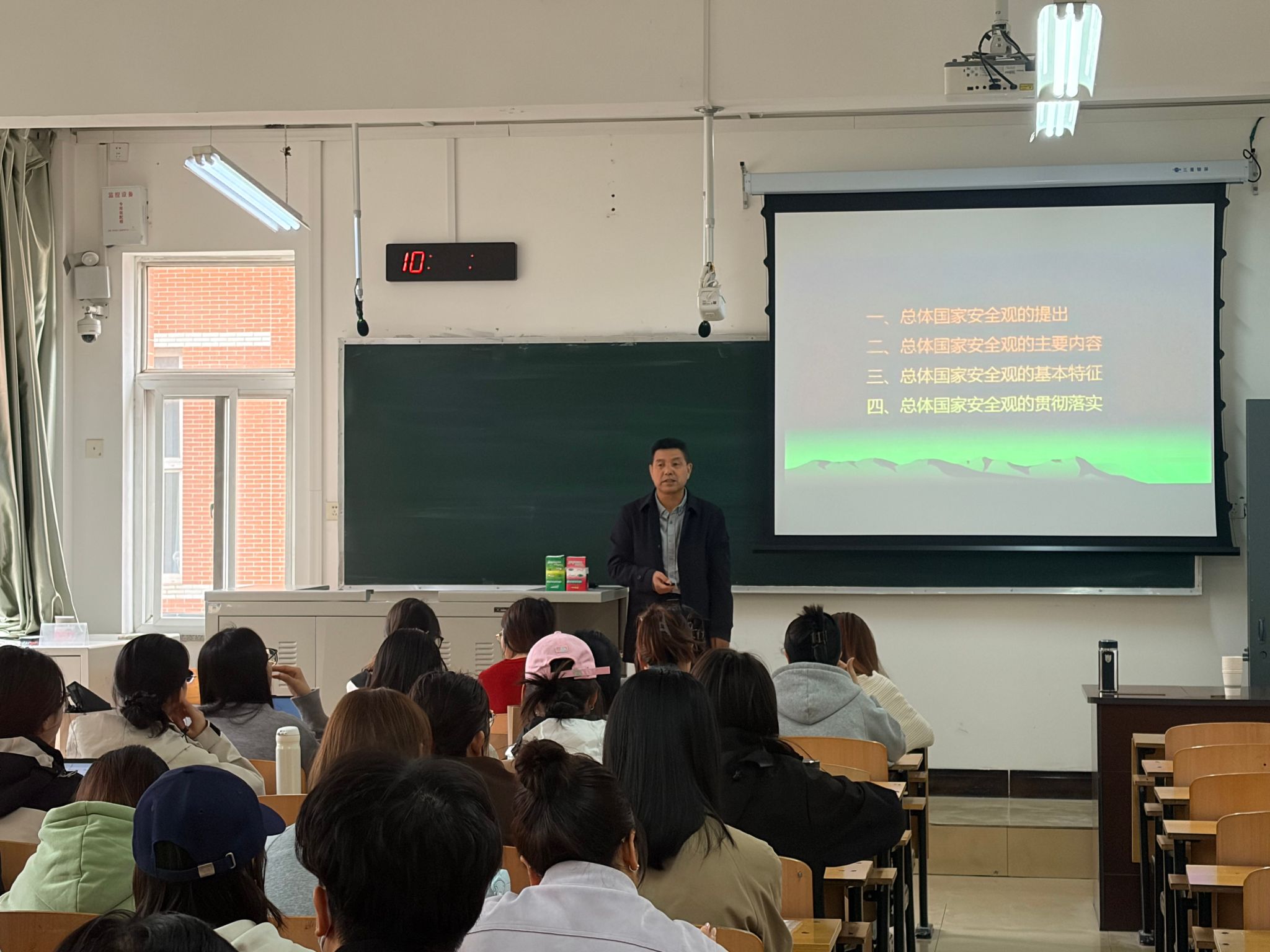 4月15日,院党委书记闫建璋在4205教室讲授“总体国家安全观”主题思政课。学院师生代表50余人参加。
