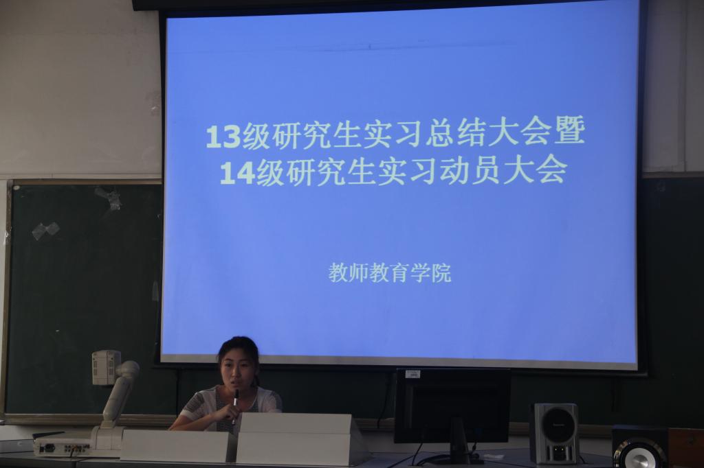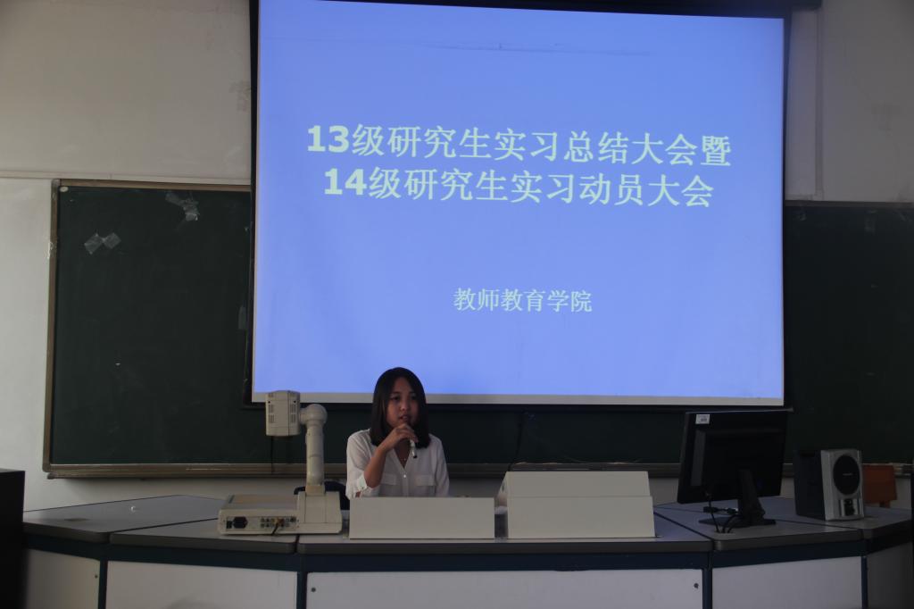 最后,张潮副院长对2013级研究生的实习汇报进行了总结,她说,从同学们的汇报中可以看出,大家教育实习的态度是认真的,实习的方向是多元化的,实习的内容比较充实,实习工作做的也很扎实,并提出了研究生实习中一些问题,希望大家改进。张潮副院长对2014级研究生的实习作了部署安排,希望他们的实习要做到三个接轨——“与学校实际接轨、与专业接轨、与时代接轨”,认真的完成好自己的教育实习。