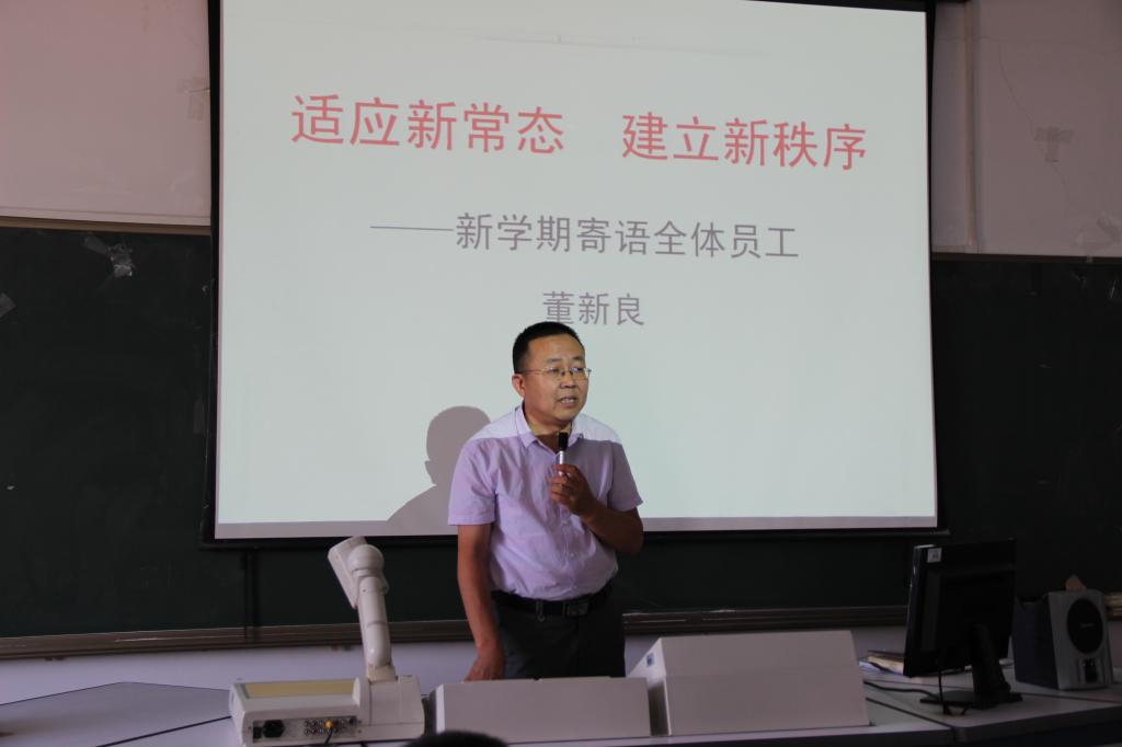 最后,董新良院长作了题为“适应新常态,建立新秩序”的讲话。讲话中,董新良院长结合当代教育改革的现状和学校、学院发展变化的实际情况,围绕“促进学院发展”的宗旨和“服务学生、成就教师”的目标,从“严格执行工作纪律,认真履行岗位职责,积极进行改革创新,适应常心态、建立新秩序”等四个方面提出了本学期工作的指导思想和发展思路,并针对教师、行政人员和管理团队三类人员提出了具体的工作要求。董新良院长希望新学期大家有新的面貌,共同努力营造既有秩序又充满活力的工作团队,让每位教师既感受到工作的乐趣、学院的温暖,又体验到生活的幸福。