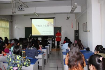 1204班学生对簕杜鹃教育集团、金紫荆教育集团、千秋集团、文华集团、晶晶国际教育集团旗下的幼儿园以及部分小型幼儿园和早教机构的教育设施、师资条件结合自身实习工作中所发现的问题与收获方面做了图文并茂的汇报,副院长张琴秀做了会议总结与点评,指出本次实习达到了预期的成效,并对13级学生即将进行的实习工作提出了指导建议。