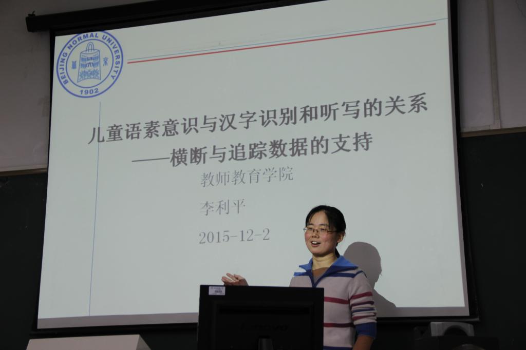 李利平老师从认知心理学的角度以汉语语素意识为切入点,通过横断和追踪的视角,运用结构方程模型等多种统计方法深入探讨了语素意识对汉字识别和听写的影响及三者的作用机制。作报告的过程中,李老师与大家分享了自己研究过程中遇到的实际问题及相应的解决办法。