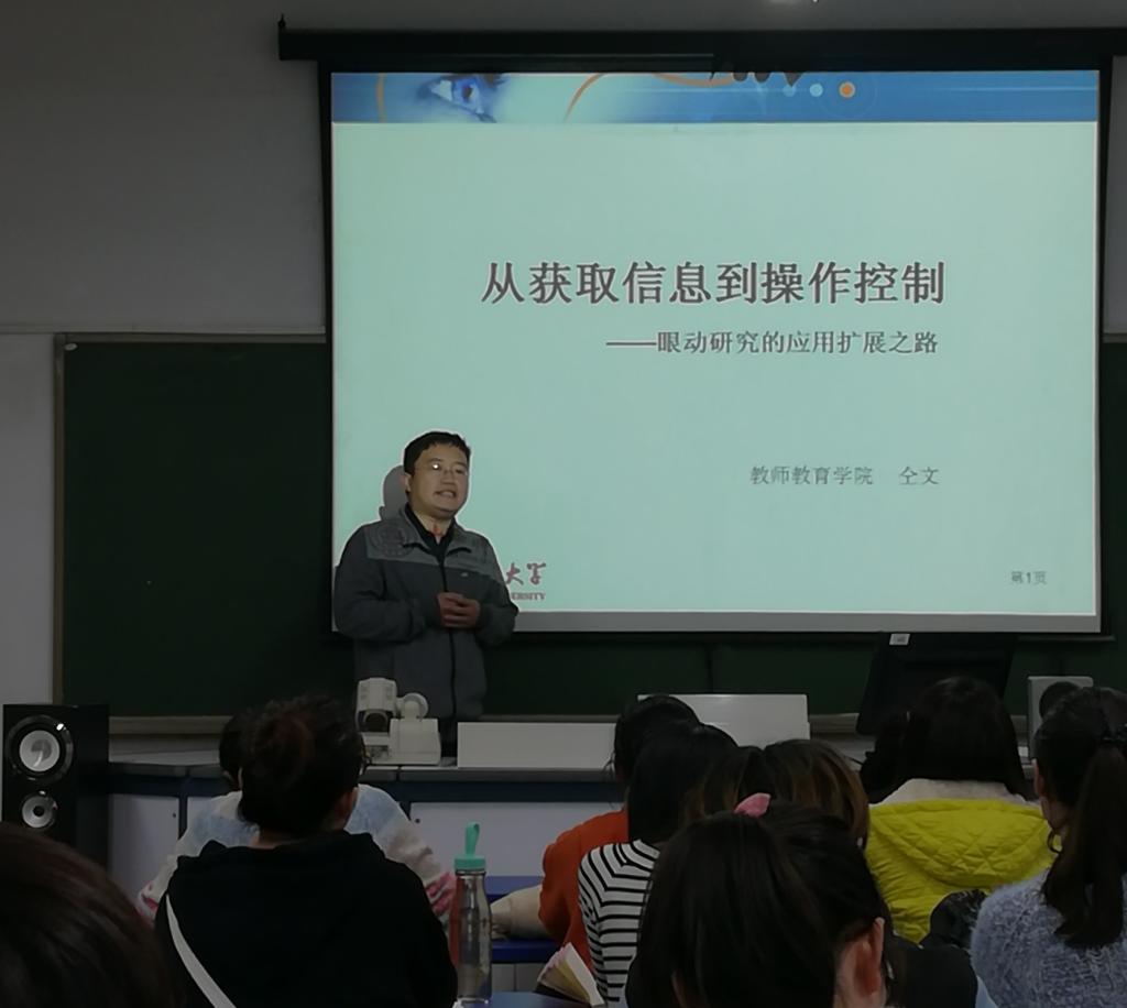 仝文老师作了《从获取信息到操作控制——眼动研究的应用扩展之路》的主题报告。仝老师在报告中介绍了眼动研究的仪器、基本形式、心理基础、研究与应用以及前景展望,让同学们对眼动有了初步了解。
