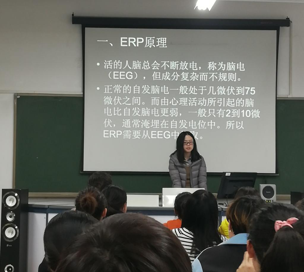 肖风老师作了《ERP技术用来记录由刺激引起的脑电变化》的主题报告,报告中详细说明了ERP的原理、主要成分以及经典研究,激发了同学们的科研兴趣。
