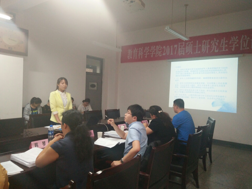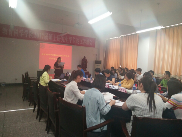 2017届教育与发展心理学硕士研究生学位论文答辩会在田家炳教学楼五层会议室举行。西安交通大学喻丰教授任答辩委员会主席主持会议,答辩组成员有张潮教授、韩琴教授、肖海雁教授、肖风博士、仝文博士,答辩秘书是谭秀娟助教。心理学一级学科专业学生柏雅颖、李亚婷等11名研究生参加答辩。