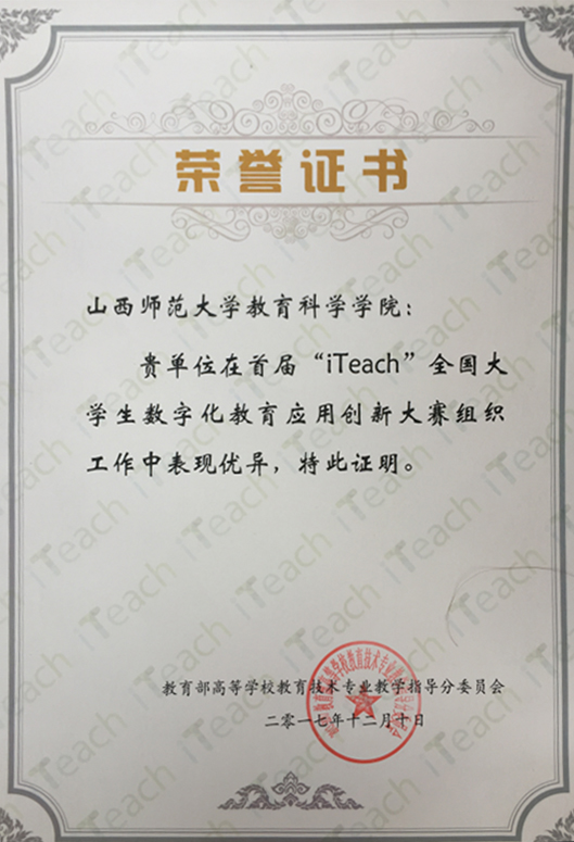 由于在本次大赛组织工作中的优异表现获得了教育部高等学校教育技术专业教学指导分委员会颁发的荣誉证书。