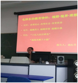 在报告开始时,韩教授用大量历史史实和个人经历向同学们展现了一个不搞个人崇拜的毛泽东形象,并且详细介绍了自己研究毛泽东的现实原因以及所经历的三个研究阶段。韩老师基于文化的两大中心和教育的两大特性,从三个方面来阐释毛泽东的教育情怀。首先,毛泽东的教育立足于大视野,以“改变民心、改变社会、改变世界”为切入点。其次,毛泽东的教育立足于现实而又有“超越圣人、超越世俗、超越自我”的境界。最后描述了“六亿人民皆舜尧”和“遍地英雄下夕烟”的两大教育理想,这三大方面相互作用构成了一个不可割裂的整体。韩老师用幽默的讲解生动地展现了对毛泽东教育情怀的独特体会,彰显了毛泽东作为政治家、哲学家、教育家对我国的教育做出的突出贡献。