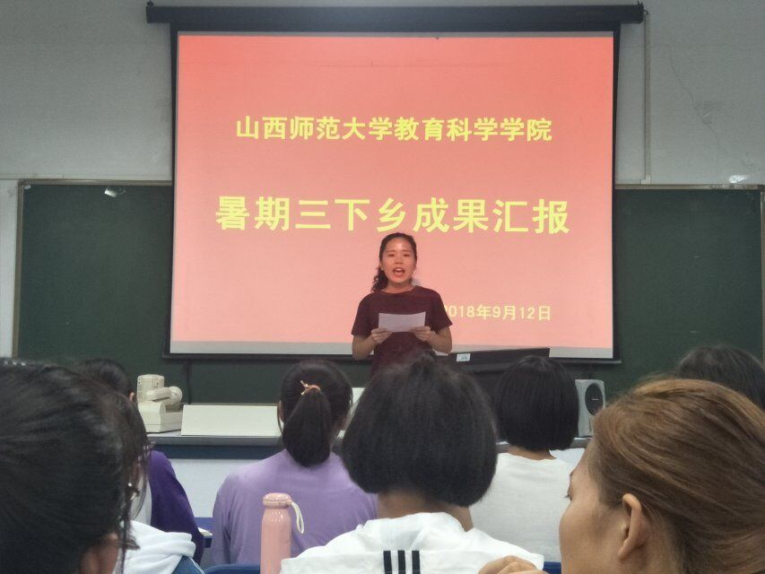 汇报会上,来自四个实践团队的学生代表以PPT和视频播放的形式与同学们分享了暑期实践的感悟。“萤火”支教服务队代表详细阐述了他们在临汾市隰县黄土小学招生、教给孩子们知识、与孩子们共同生活学习的经过,引起在场人的强烈共鸣;“焰之队”实践队通过“红色寻访”的形式传达了革命先驱的优秀事迹,他们走访了文水县老革命党人陈德邻先生,感受到了那份属于中国人的骄傲和自豪;“育人暖阳”实践团队在小榆东村和老年人促膝长谈,与小朋友嬉戏玩耍,传达出“育人如暖阳、真情献社会”的实践真理;“心之新源”服务队分享了他们在关王庙中心小学开展的心理班会、心理普查以及课业辅导的活动,通过一系列的服务,孩子们了解到亲子、师生、同伴关系在成长中的作用,领悟到增强学习效果的方法,获得了更多的心理支持。