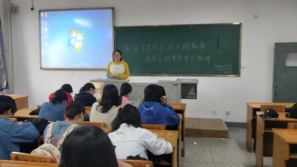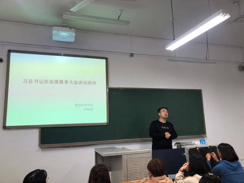 各班组织同学观看了CCTV13关于习近平在全国教育大会上视频剪辑,对本次全国教育大会有所了解;随后,由主持人对国家主席习近平在全国教育大会上的重要讲话精神做了概述;最后同学们自由讨论,对习近平在全国教育大会上的重要讲话精神进行小组学习。通过本次班会,大家感受到了党中央对教育事业的重视,对教师职业的重视,纷纷表示作为师范大学的学生,应该响应国家号召,努力把自己塑造成一个合格的人民教师。