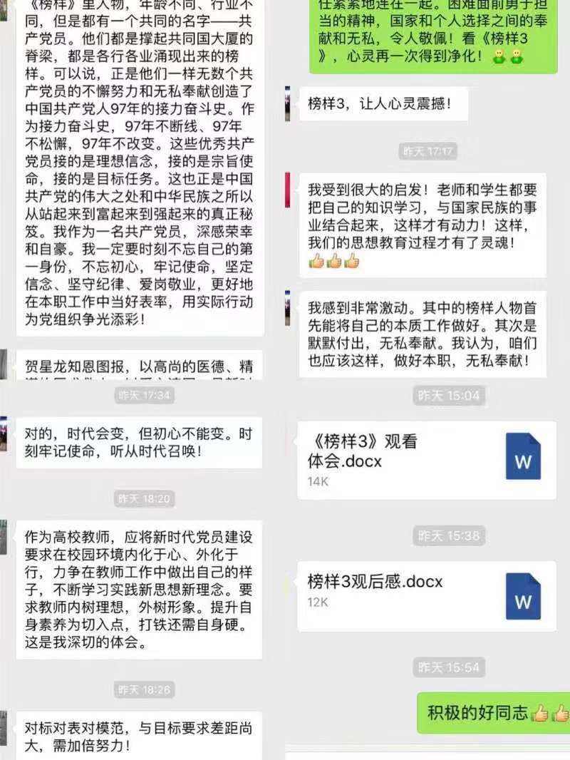 教育系全体党员在党支部的号召下,认真观看了《榜样3》视频资料,学习了《新时代高校教师职业行为十项准则》等文件,并在约定的时间进行了线上交流。党员同志们在观看视频时都深受感动,院党委书记吴文国在线上与大家做了深入的交流,他从国家和民族富强的高度评价了这些既普通又不平凡的“榜样们”的不懈努力和无私奉献,表达了时刻不忘自己“党员”的第一身份,要牢记使命、坚定信念、坚守纪律、爱岗敬业,更好地在本职工作中当好表率!王瑞朋同志表示,他也受到很大的启发!他认为,老师和学生都要把自己的知识学习与国家、民族的事业结合起来,这样才有动力,思想教育过程才有了灵魂!