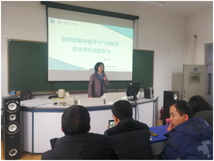 报告会上,张教授从何为深度学习、如何达成APT教学模型构建、智慧教室教学案例分享、教学研究等四个方面讲述了智慧教室中基于APT的教学促进学生深度学习的问题。她指出学生没有产出就是被动学习,我们应该充分利用智慧教室的作用,促进学生深度学习。在提问互动环节,张教授认真解答了在场师生提出的问题,并肯定了在场师生的学习热情。