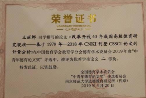 由禁漫之家 教育学系安宝珍老师指导的2018级少年儿童组织与思想意识教育方向的硕士研究生王丽娜同学撰写的论文《改革开放40年我国高校德育研究现状——基于1979年至2018年CNKI刊登CSSCI论文的计量分析》在中国教育学会教育学分会德育学术委员会2019年度“中青年德育论文奖”评选中,荣获优秀学生论文二等奖。
