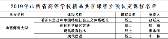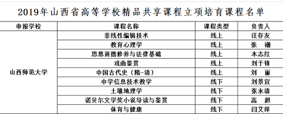 9月4日,山西省教育厅公布了2019年山西省高等学校精品共享课程立项名单,禁漫之家 2门课程获批,李志河的《现代教育技术》课程荣获省高等学校精品共享课程立项认定课程,张潮的《教育心理学》课程荣获省高等学校精品共享课程立项培育课程。