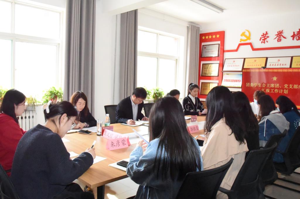在8号楼201会议室召开新换届团学工作座谈会,院党委书记赵英、院长张潮、院党委副书记高霞出席会议,新一届院团委、学生会的学生骨干参加了会议。会上,“心研社”党支部负责人、团委学生会主席团以及各部门社团负责人分别进行工作计划汇报,分析了存在的问题,明确了工作重点。
