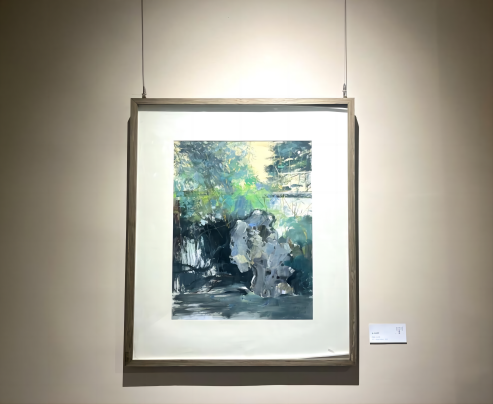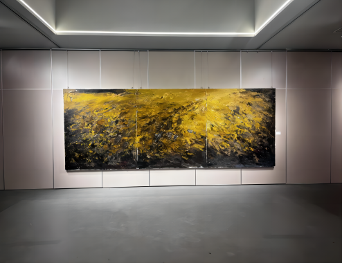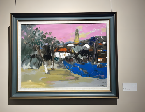 美术馆内,金小民介绍了他创作的心路历程。从一进门的题字,“今年的冬天不是很冷..”把我们慢慢带入一个艺术的殿堂。一幅幅画作凝练着他的情和意,他说‘绘画者是以笔说话,以画说话’的。创作者使用画笔感受着当下社会的沧桑变化。《疫情之下》简单的两根油条,不仅传达出一种生活气息,更体现出一种疫情防控期间积极乐观生活的心态。《文人驻梦》园林中的美景,白墙黑瓦、绿竹、太湖石。展厅中长达六米、高两米的大型画作《黄河黄河》黄河母亲的磅礴气势在展厅中蔓延,画中的几艘皮筏显得那么渺小,但又那么有力量感,“蜉蝣撼树”给人一种心灵的冲击。从写实派到印象派、从古典到近现代,纵横交错的艺术历史,金小民院长娓娓道来。类型多样的作品无处不体现他作为一名创作者,有温度、有深度的思考。