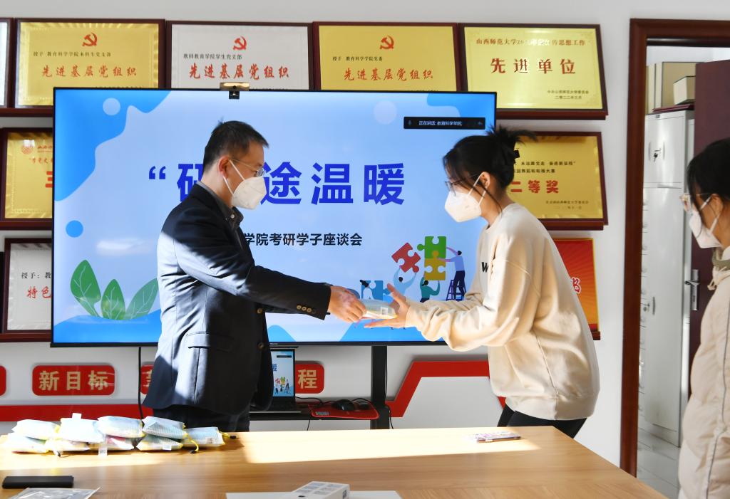 据悉,学院精心为每位考研学生准备了考试用品和防疫用品。白文宏副校长现场向参会学生代表发放了考研和防疫用品,送上了学校的亲切慰问。