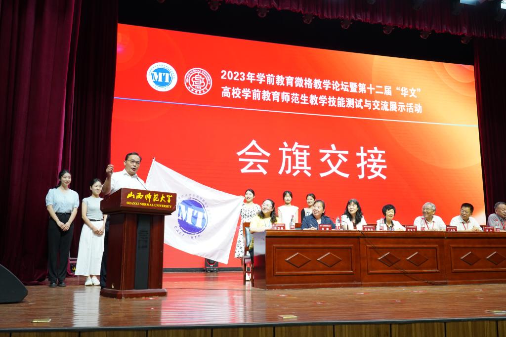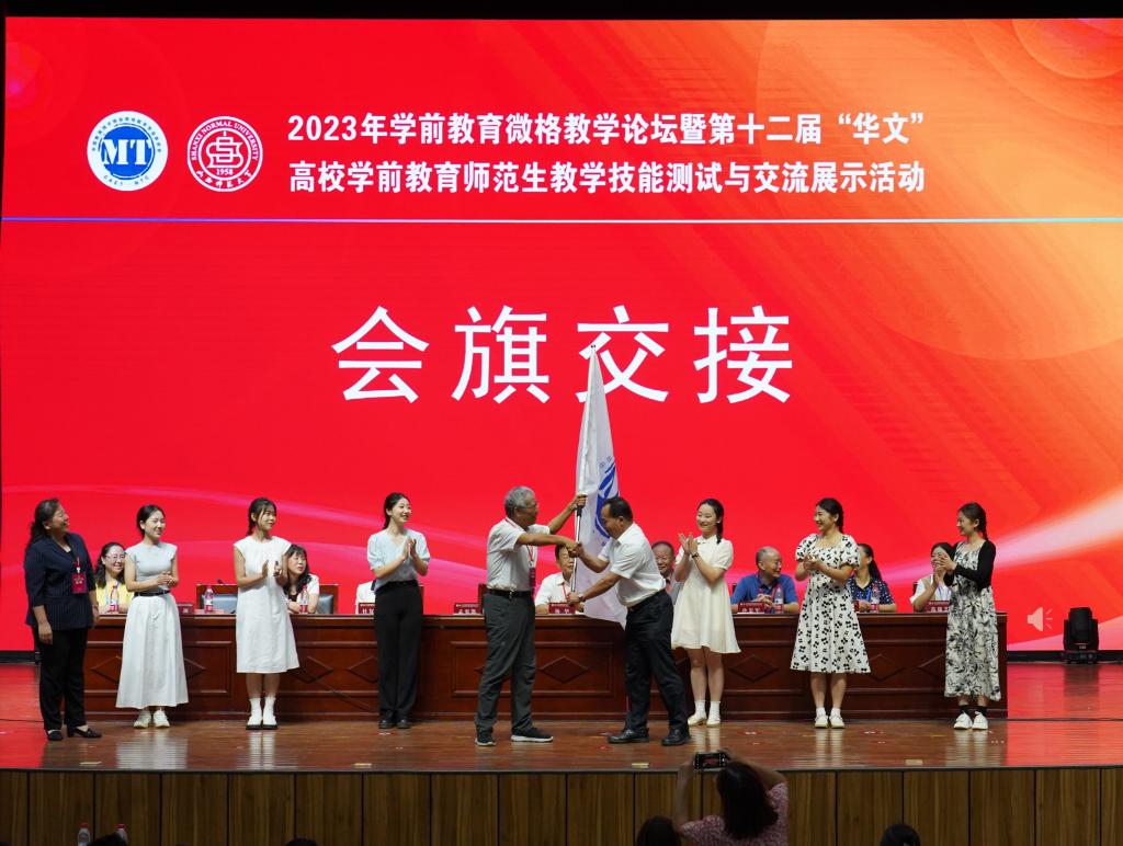 院长张潮宣布了获得下一届举办权的学校——黄冈师范学院,并与黄冈师范学院进行了会旗交接。第十三届“华文”高校学前教育师范生教学能力测试与交流展示活动承办单位代表黄冈师范学院院长陈中文在发言中对我校的精心组织、周密安排表示衷心感谢,并代表黄冈师范学院教育学院郑重承诺,他们有信心、有能力、有条件,优质、高效、安全地做好第十三届“华文”高校学前教育师范生教学技能大赛的服务工作。