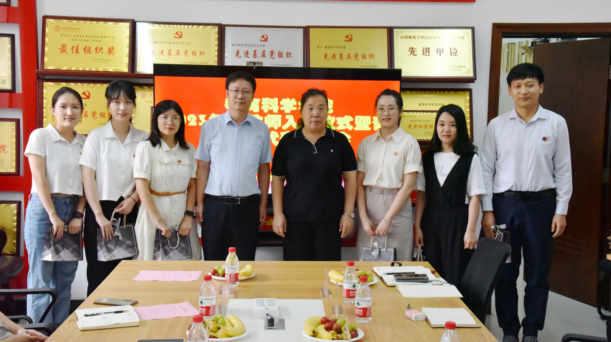 会议首先举行新教师入职仪式,张潮院长为新入职教师佩戴校徽,赵英书记向新教师赠送教师节礼物。