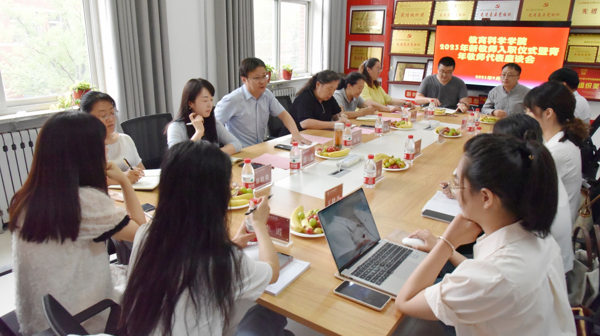 于2023年9月8日下午在8号教学楼201会议室召开新教师入职仪式暨青年教师代表座谈会。院党委书记赵英、院长张潮、院党委副书记高霞、副院长韩琴、副院长郑晓俊、院长助理李慧燕及新入职教师杨勇勇、王晓丹、贺晓丽、刘佳、王佳昕和青年教师代表谭秀娟、王馨蕊、李霞、时益之、许施扬参加会议。会议由赵英书记主持。