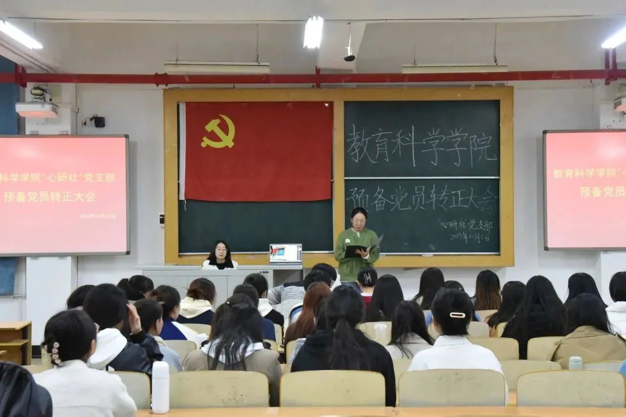 “心研社”党支部在5409教室召开预备党员转正大会,专职辅导员段慧馨老师及“心研社”党支部全体党员参加本次会议。