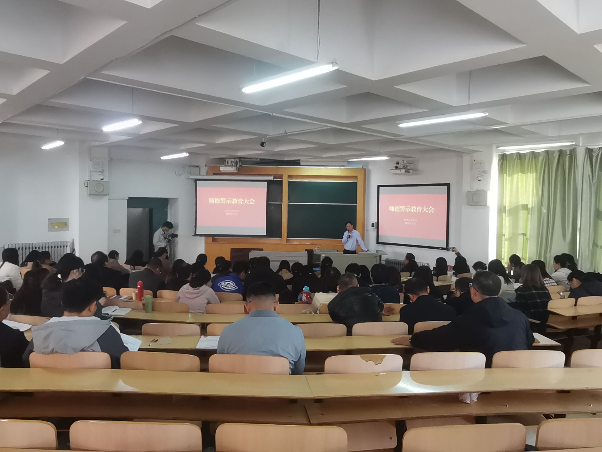 在南区4号教学楼213教室召开全体教职工集体学习会暨师德师风警示教育会议,会议由院长张潮主持,院党委书记赵英作专题辅导报告。
