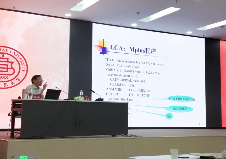 5月24日上午的培训主题为《潜在类别分析与潜在转变分析》,主持人为教师教育学院副院长刘岗。温教授从“基于变量关系的研究可能面临的问题”引出多种潜变量测量模型,对其原理、操作要点和分析思路进行了详细讲解。