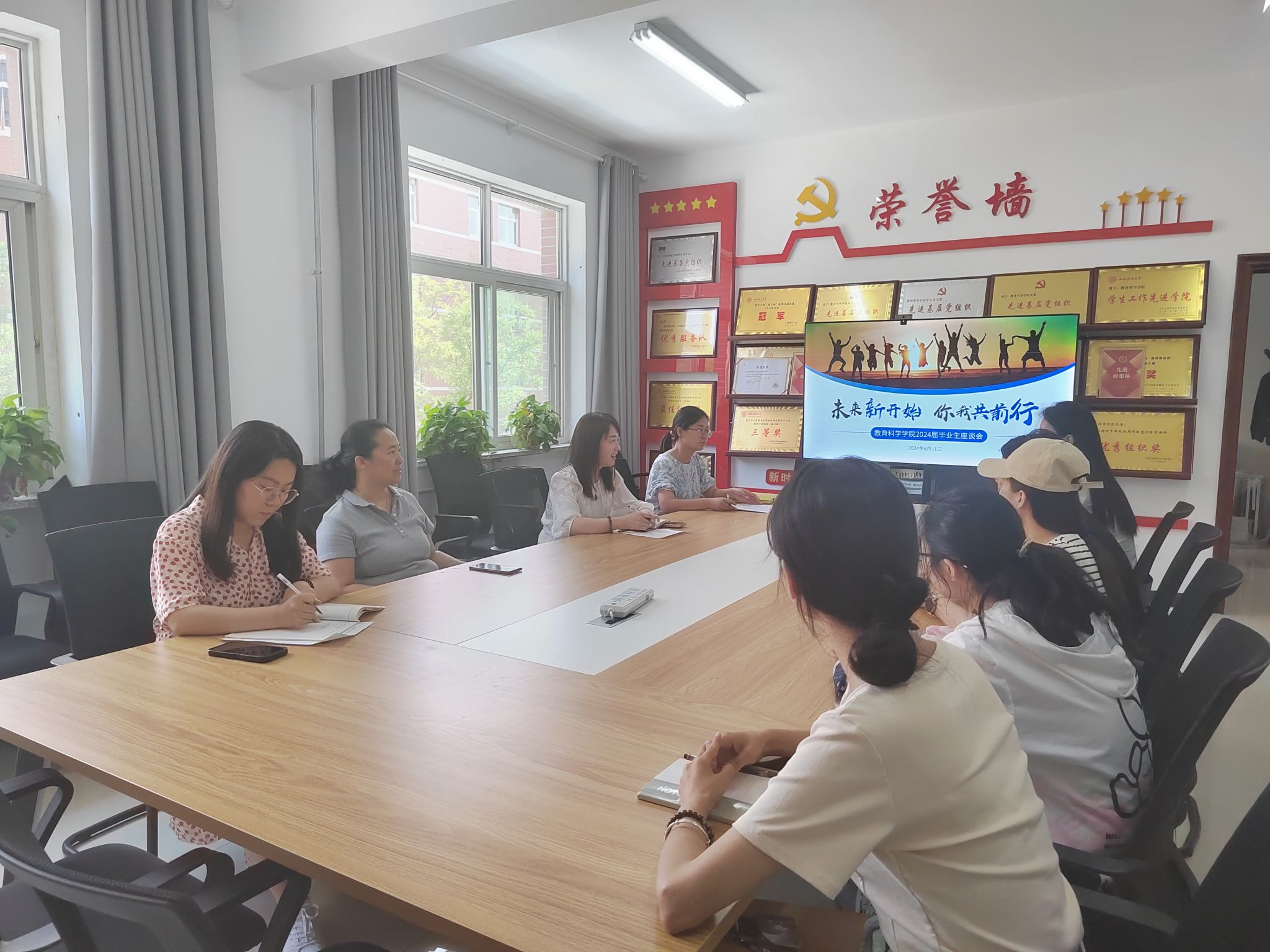 在8号教学楼201会议室召开2024届本科毕业生座谈会,院党委副书记高霞、副院长韩琴、院团委副书记高敏君、专职辅导员段慧馨和毕业生代表参加。