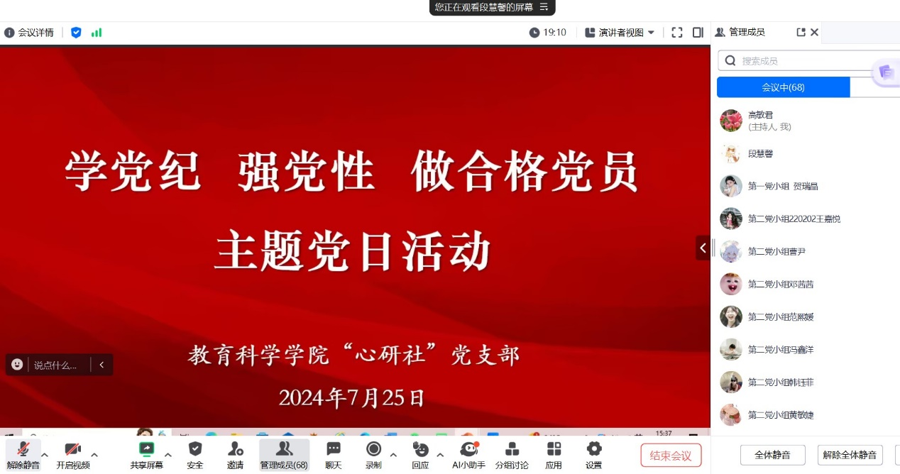 “心研社”党支部通过腾讯会议举办了“学党纪 强党性 做合格党员”主题党日活动。校党委常委、副校长白文宏出席活动并进行指导。支部联系领导、院党委书记赵英全程参加活动并寄语支部党员。“心研社”党支部全体党员参加了活动。