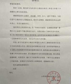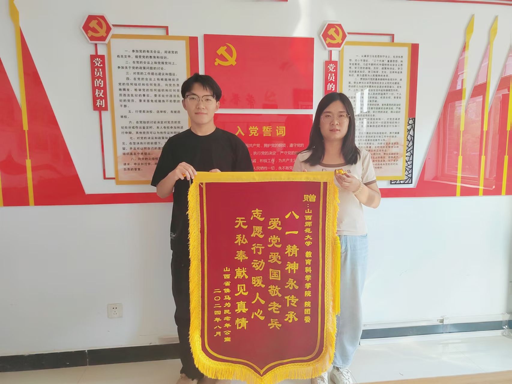 团委收到了一份特殊的礼物,是山西省侯马为民老年公寓送来的一面写有“八一精神永传承 爱党爱国敬老兵 志愿行动暖人心 无私奉献见真情”的锦旗。