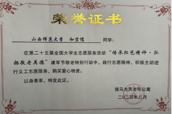 23150201班学生和宏儒,在暑期“三下乡”活动中,赴山西省侯马市为民老年公寓参加了为期一个月的“传承红色基因,弘扬敬老美德”暑期社会公益建军节敬老特别行动,照顾因公伤残转业的老兵们的生活起居、宣传健康知识、倾听他们的心声等,用实际行动为他人、为社会作贡献。他任劳任怨、无私奉献,受到了老兵们的一致好评。在实践的过程中,他深刻体会到了服务他人的成就感和责任感,希望通过自己的努力,带动身边的人一起投入到志愿服务当中,正如他在日记中写到的“我也真想成为像陈祥榕、黄文秀这样优秀的青年和共产党员”的愿望。