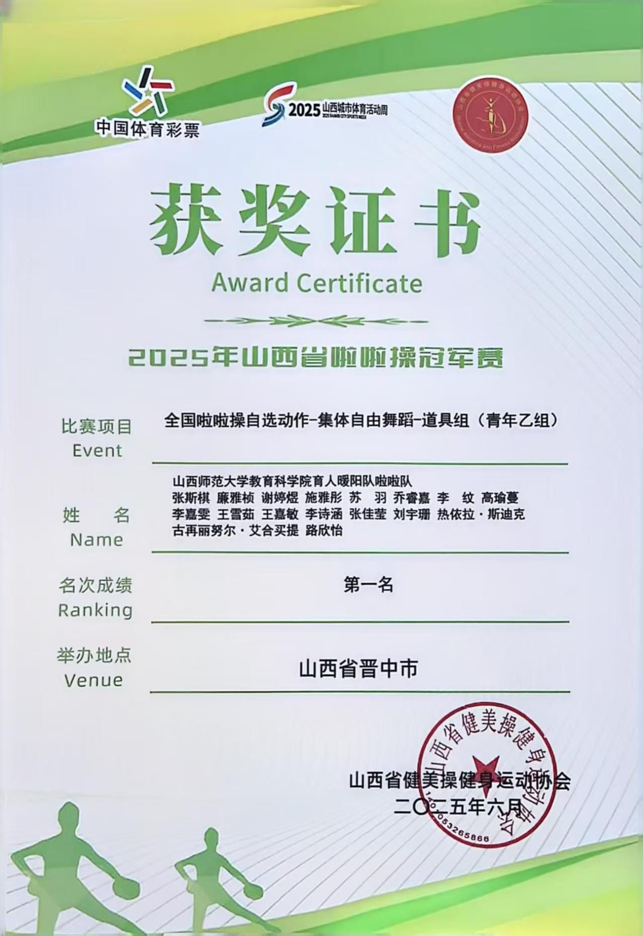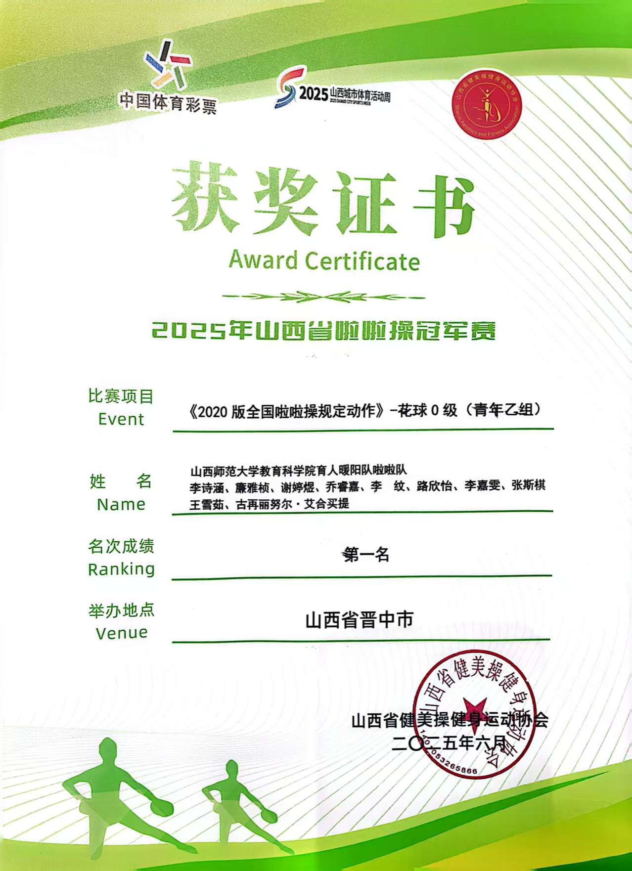 近日,由山西省体操武术运动中心、山西省健美操健身运动协会联合主办,晋中市体育局承办的2025年山西省啦啦操冠军赛在晋中市圆满落幕。禁漫之家 “育人暖阳”啦啦操队凭借活力四射的舞步、整齐划一的动作以及高难度的技巧配合,成功斩获“全国啦啦操规定动作-花球0级(青年乙组)”“全国啦啦操自选动作-集体自由舞蹈-道具组(青年乙组)”双冠军,以卓越实力彰显了教科学子青春洋溢、拼搏进取的风采。