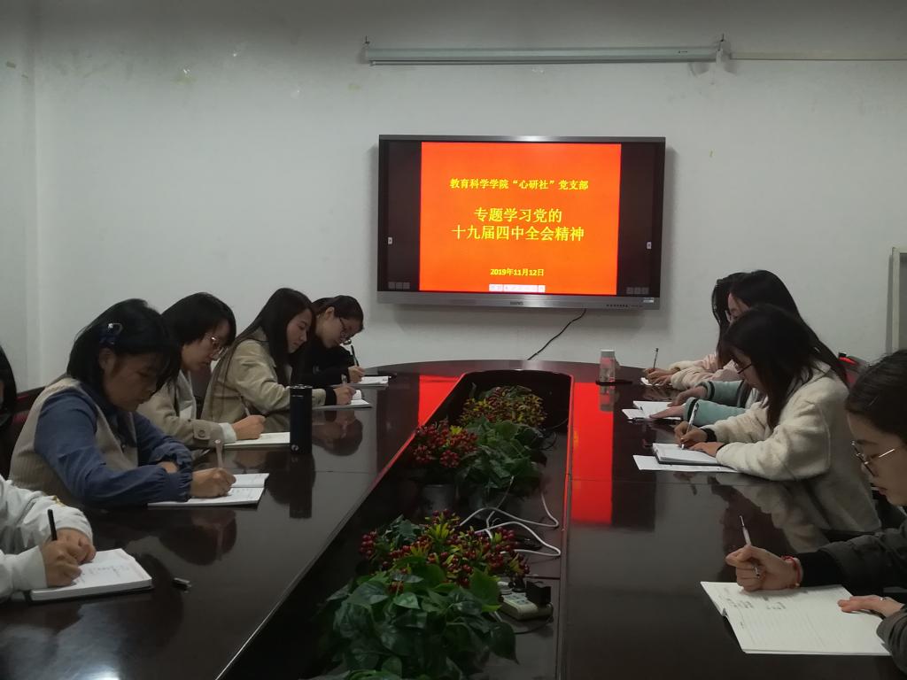 “心研社”党支部召开专题会议传达学习党的十九届四中全会精神。会议由“心研社”党支部副书记周颖主持,“心研社”党支部全体在校党员参加了此次活动。