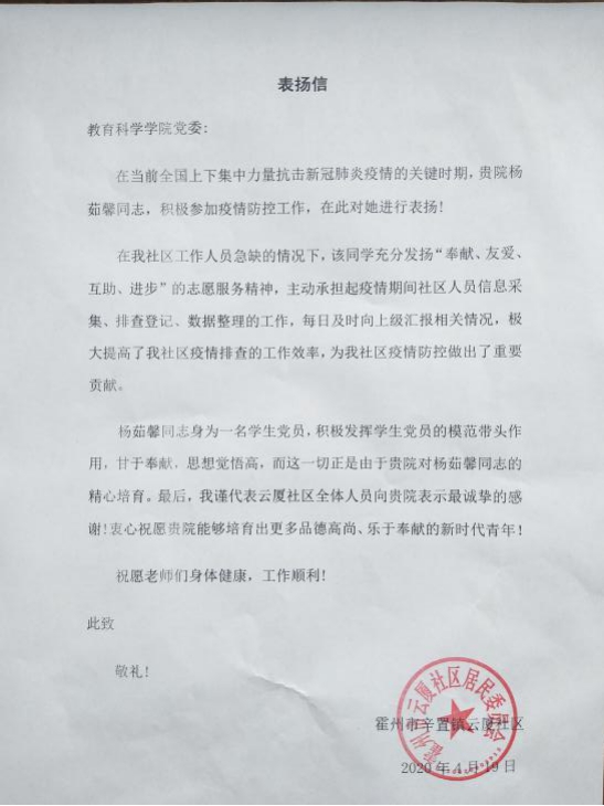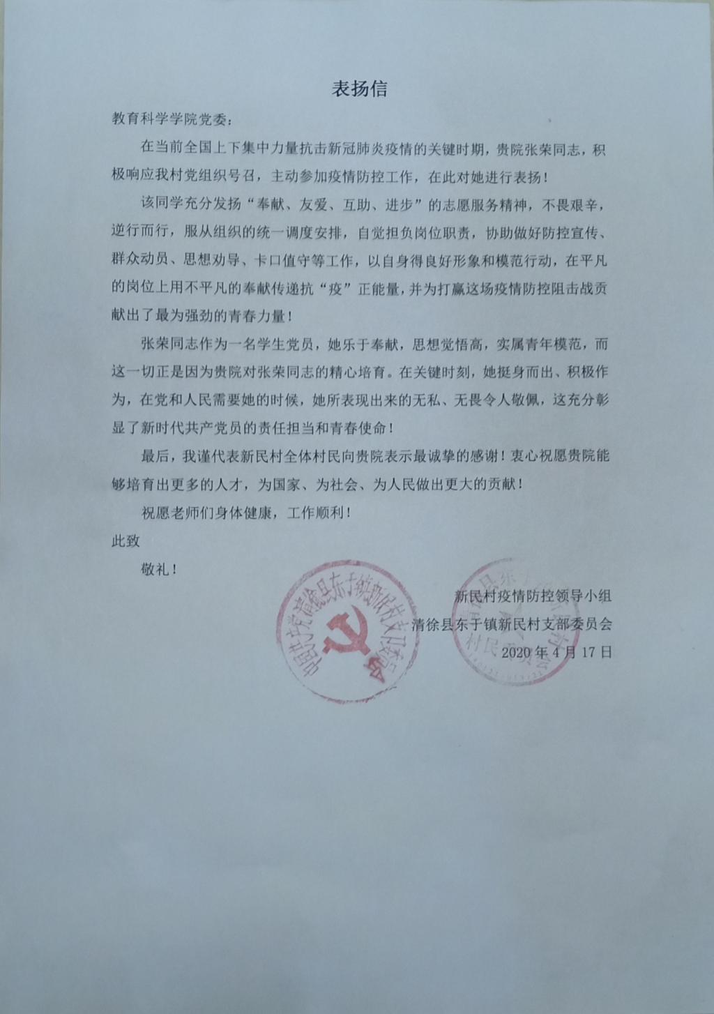 近日,禁漫之家 收到了社会各界发来的多封表扬信,对学院“心研社”党支部学生党员在疫情期间积极响应号召,主动参与疫情防控工作,承担社会责任的行为提出了表扬。