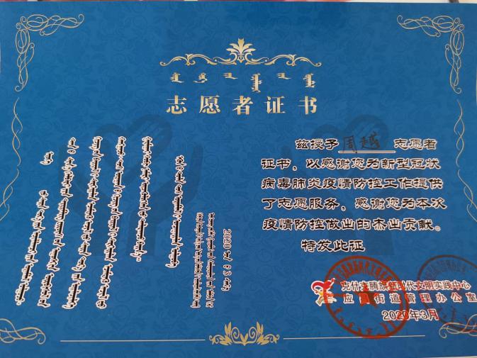 禁漫之家 “心研社”党支部的学生党员在疫情期间不忘党员使命,积极主动地参与疫情防控志愿者服务工作,践行了新时代的党员精神,彰显了新时代共产党员的责任担当和青春使命。赵媛媛、张艺、华凯婷、张荣、郑一敏、周越等同学加入疫情防控志愿者队伍,在工作中认真负责,服从安排,完成了多项志愿工作,为防控工作做出了贡献,传递了抗“疫”正能量。一些基层团组织、村委会或居委会为他们发来了表扬信或荣誉证书,对他们的工作表示认可和赞扬。