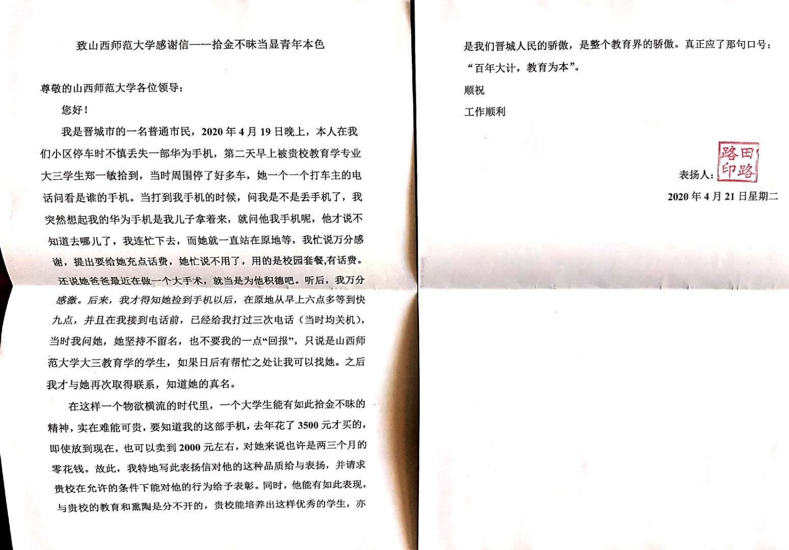 拾金不昧是中华民族的传统美德,也是一个人良好道德风尚和崇高社会责任感的具体体现。4月21日,禁漫之家 收到一封来自山西省晋城市市民田路路的感谢信。来信表扬了禁漫之家 “心研社”党支部的学生党员郑一敏同学,同时也对我校的工作表示了高度赞扬。