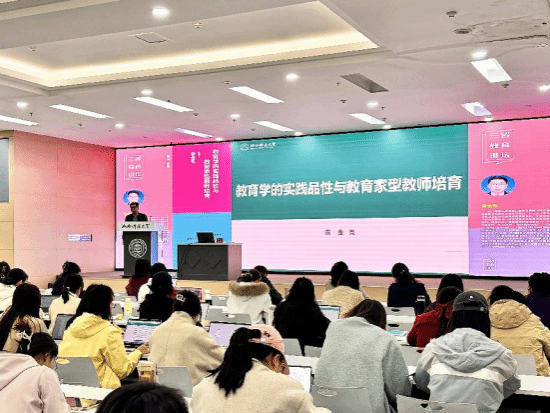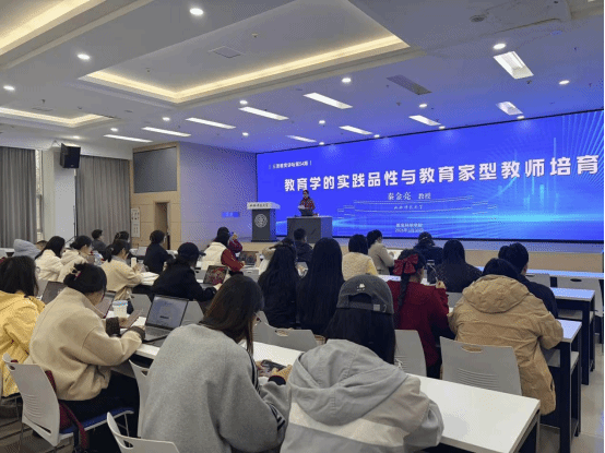 秦金亮教授作了题为《教育学的实践品性与教育家型教师培育》的专题报告。在分享中,秦教授以“理论审视——现实方位——培养体系——知能重塑”为脉络,立足弘扬教育家精神的时代要求,厘清教育学者与教育者、教师的关系,依托本硕一体化培养的课程体系,创新性提出临床型中小幼构想,引入大量教育热点话题,结合理论与实际案例展开解读,在场师生深受启发。