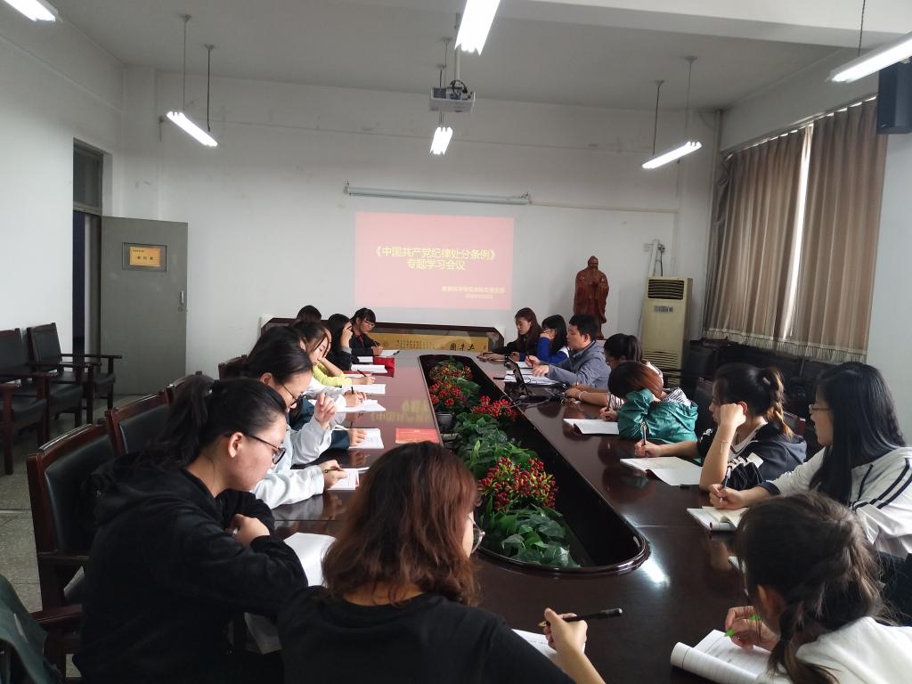 宁志恒老师就《中国共产党纪律处分条例》制定的意义进行阐述,从《条例》修订后的八大亮点进行详细讲解,还安排组织党支部分小组继续进行深度学习,及时反馈学习情况;传达《关于做好2018年中秋国庆期间监督检查中央八项规定精神和纠正“四风”工作的通知》文件精神,强调了一定要严格遵守学校的各项要求和规定,提倡反腐倡廉,过一个风清气正的节日。
