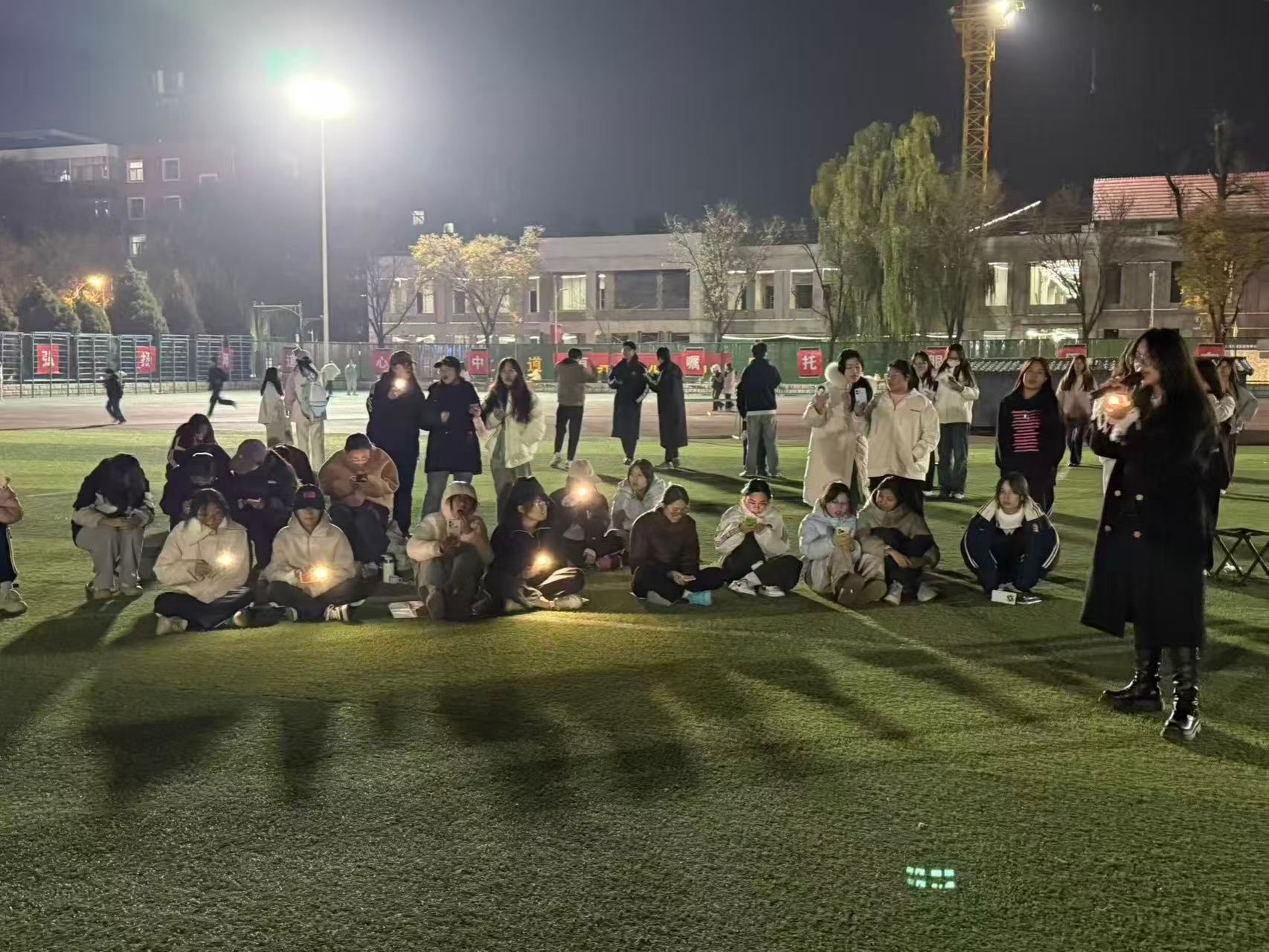 彩色小球随音乐在人群中轻盈传递,每一次停顿都迎来即兴清唱,激起阵阵欢笑;《小幸运》《稻香》熟悉的旋律响起,全场齐声接唱,秋夜瞬间被青春点燃。最动人的是合唱时刻——同学们纷纷举起手机,点点微光在深蓝暮色中连成一片摇曳星海,将夜晚氛围推向高潮。歌声流淌,光影摇曳,这个秋夜在旋律与温暖中定格成校园记忆中一抹明亮的色彩。