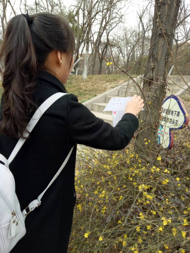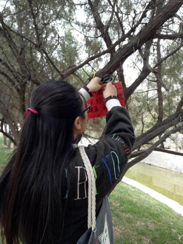 活动中,同学们亲手制作保护树木的宣传标语,并把宣传标语挂到校园的树木上,呼吁大家爱护树木。